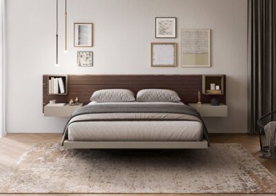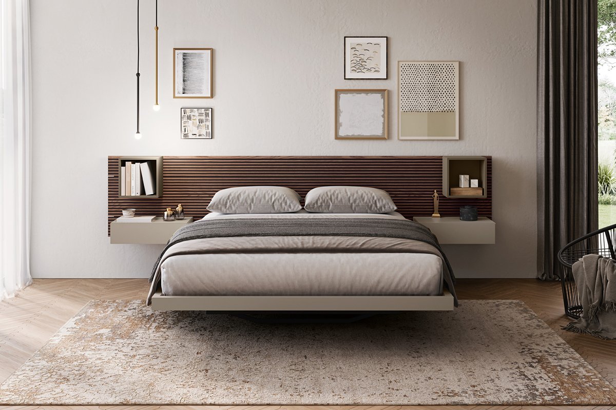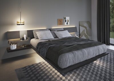 For the sleeping area, Fimar offers a range of modern beds, such as the Sorvolo and Icaro models, also available with storage, as well as dressers and nightstands with fine finishes and wardrobes that integrate functional solutions like retractable TV holders.