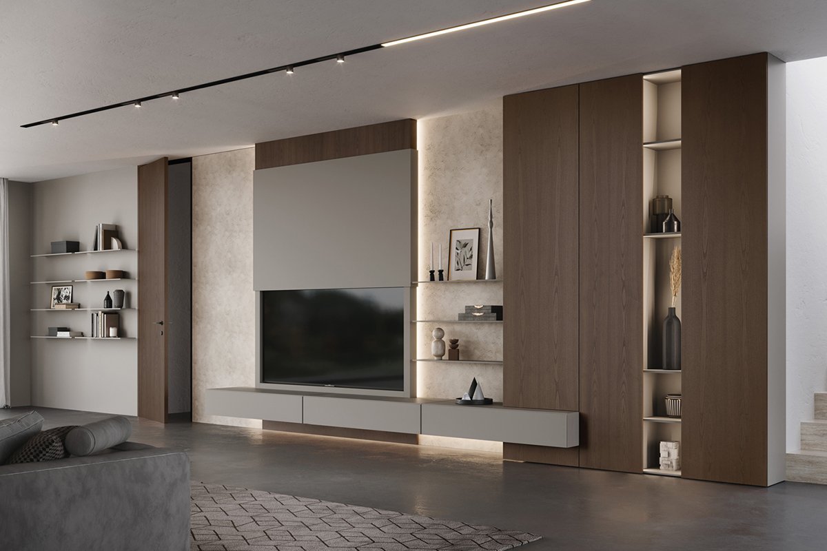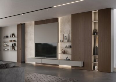 For the living area, Fimar expresses its full creativity with advanced modular systems. The Sorvolo D System offers innovative solutions that integrate TV holders and multifunctional spaces, creating unique, custom-made environments. The Rebel System is distinguished by the elegance of its 45-degree containers, thin doors, and metal frames, completed by integrated wall paneling and TV holders for total customization. The Side System, meanwhile, represents a disaggregated proposal where the play of thicknesses and materials, such as handleless doors, creates a perfect balance between aesthetics and practicality.