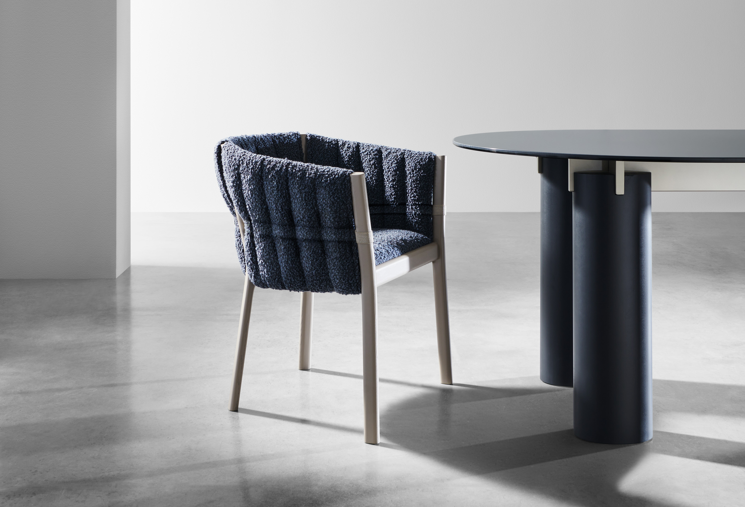 Among the most significant proposals is the Mae family by Marco Acerbis, which brings the sculptural conical base of its tables from the outdoors to the indoors with refined hand-troweled finishes. The Pier bedroom collection, designed by Oscar e Gabriele Buratti, combines the clean lines of ash wood with the soft, textural quality of woven cord handles. The Strap bed by Neri&Hu is a masterpiece of design, where a wooden headboard is wrapped in soft upholstery fastened by a leather strap. Timeless icons by Paola Navone, such as the sartorial Ghost chair and the Brick table with its artisanal cylindrical legs, coexist with new additions like the Kira coffee table by Marta Giardini, a play of full and empty volumes in sparkling aluminum.