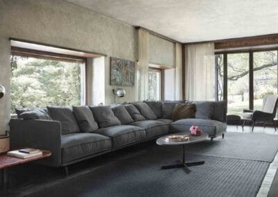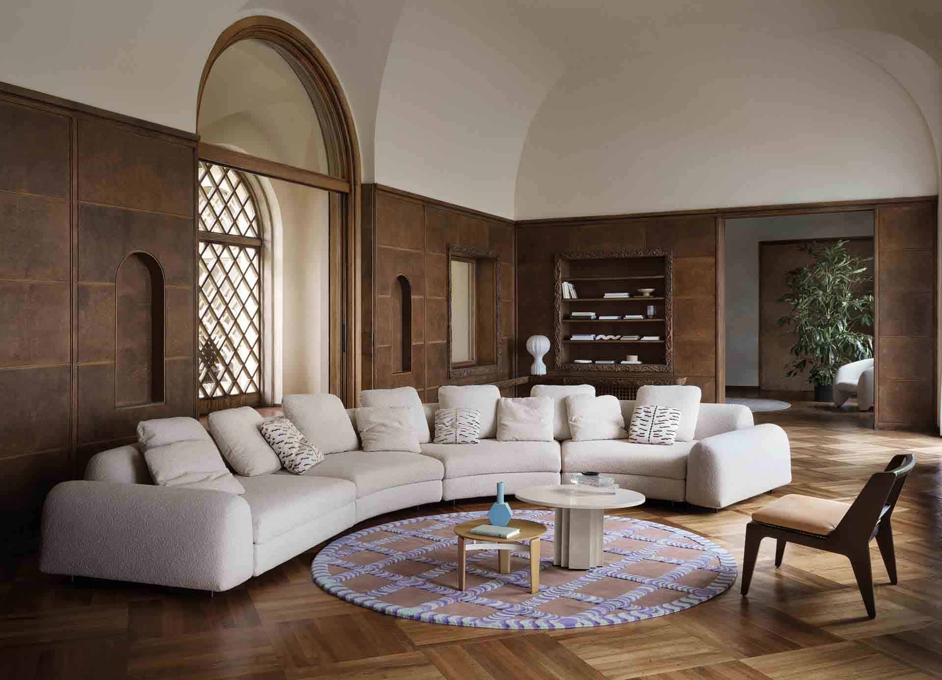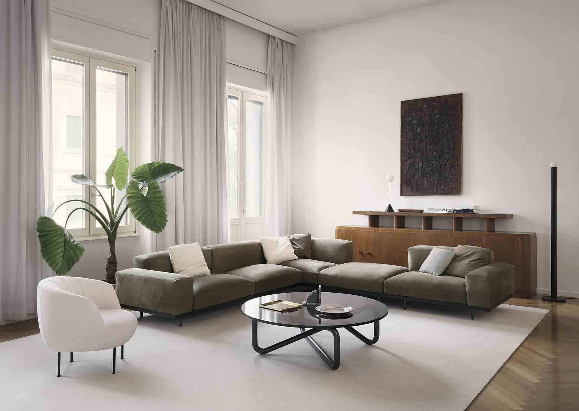 Il suo successo risiede nella semplicità delle forme e nella straordinaria comodità: i cuscini, generosi e morbidi, sembrano poggiare liberamente sulla struttura, creando un effetto di leggerezza visiva e accoglienza totale.